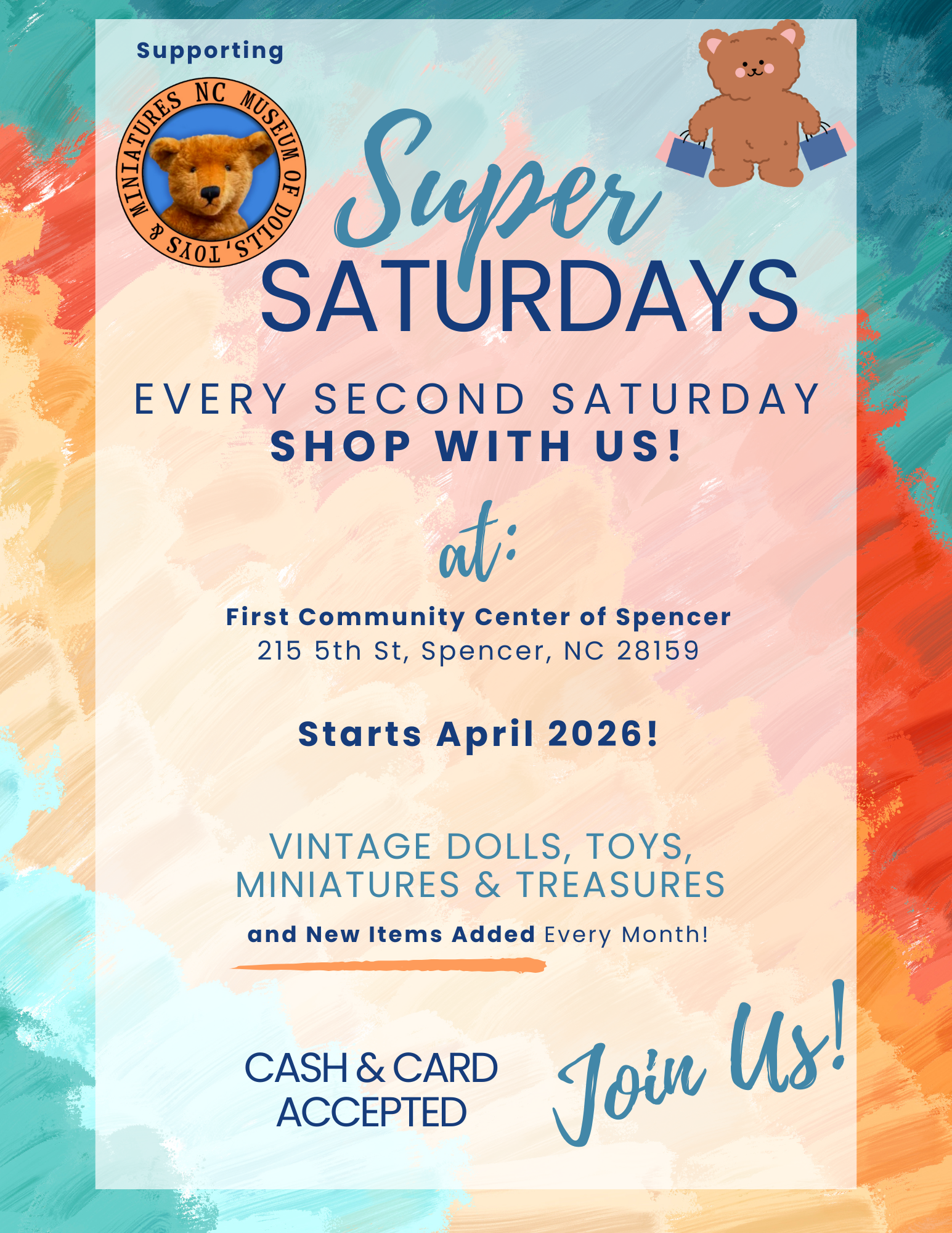 Shop for dolls, toys, trains, miniatures, and plush to support the museum every second Saturday starting April 2026!