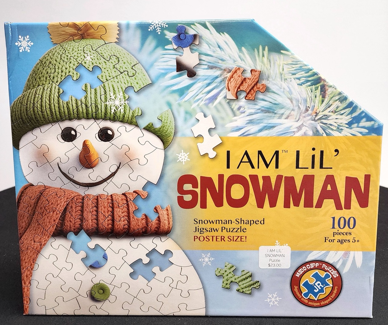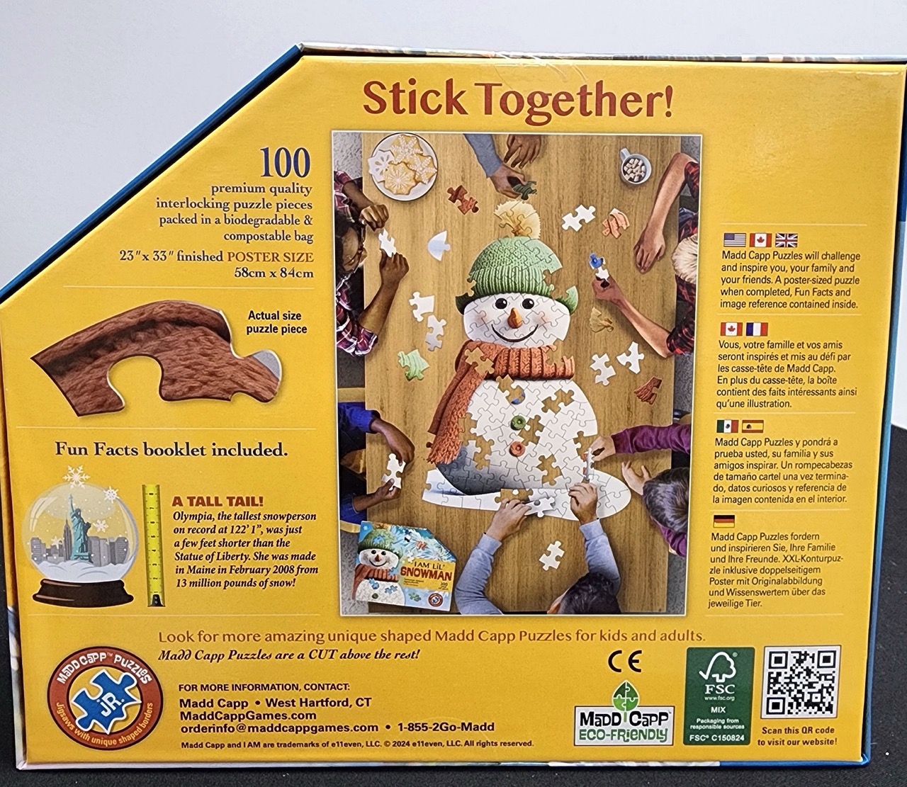 This Madd Capp puzzle is in the shape of a Snowman. For ages 5+, this Snowman-Shaped puzzle is poster sized, with 100 premium quality interlocking pieces all packed in a biodegradable and compostable bag. Includes a fun facts book that adds a unique educational element to the fun.