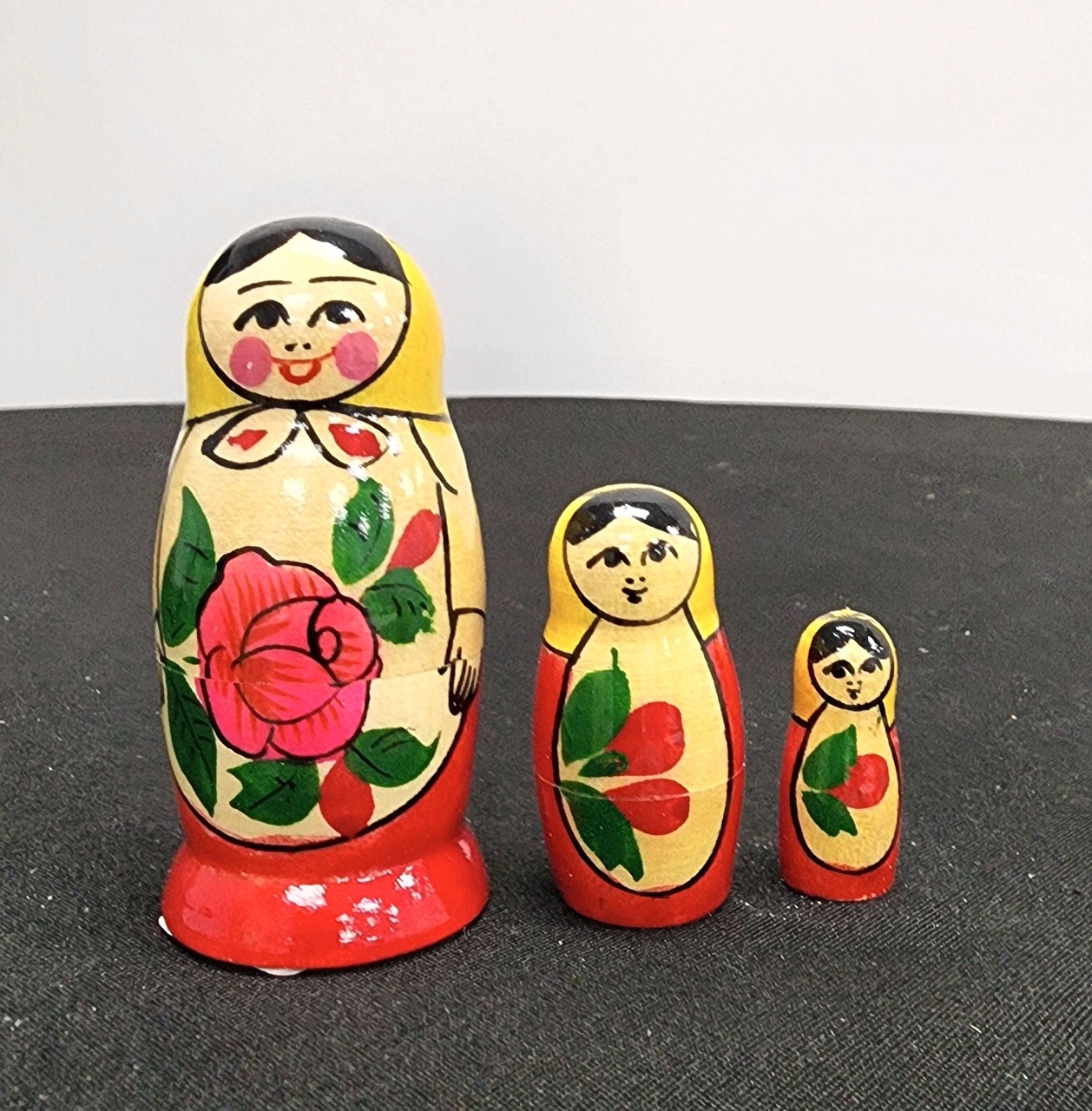 The outer doll showcases the signature Semenov style with a bold red rose, green leaves, and warm natural wood tones, accented by a bright yellow headscarf and red base. The two inner maidens continue the theme with coordinating patterns, making this a cohesive and eye-catching miniature set.